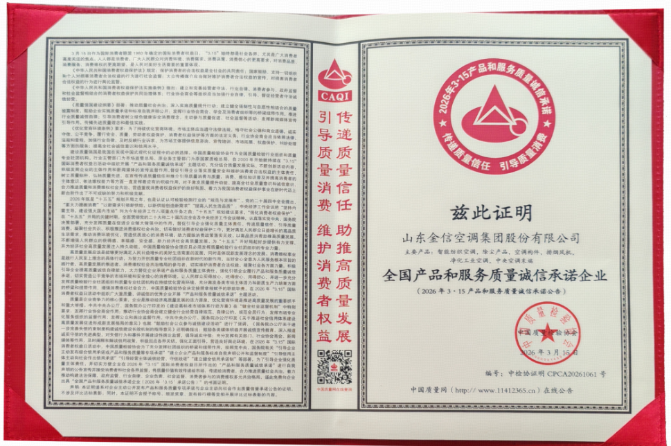 近日,山东金信空调集团股份有限公司凭借卓越的质量管控体系与诚信经营实践,成功入选中国质量检验协会 “全国产品和服务质量诚信企业” 名单。