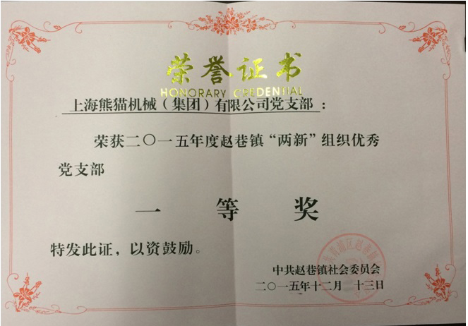 2015年12月10日,赵巷镇两新组织党务工作2015年表彰大会在赵巷镇政府召开,熊猫机械党支部被授予“赵巷镇两新党建工作一等奖” 、党支部书记柳汉莹荣获“赵巷镇‘两新’组织优秀党务工作者”、杨渠荣获“赵巷镇‘两新’组织优秀信息员”称号,受到镇社会党委的表彰。