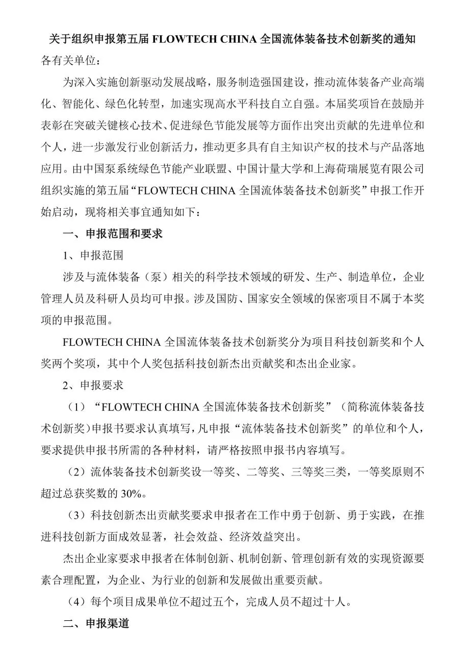 01、为深入实施创新驱动发展战略,服务制造强国建设,推动流体装备产业高端化、智能化、绿色化转型,加速实现高水平科技自立自强,进一步激发行业创新活力,推动更多具有自主知识产权的技术与产品落地应用。第五届“FLOWTECH CHINA全国流体装备技术创新奖”申报工作已正式启动。