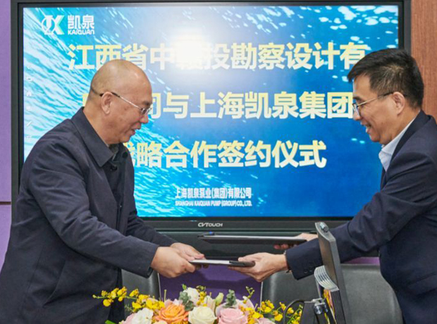 11月11日,凯泉泵业集团与江西省中赣投勘察设计有限公司(以下简称“中赣投”)在凯泉上海工业园举行了隆重的签约仪式,双方正式签署了“战略合作框架协议书”,开启了全面深入的合作关系。上海凯泉泵业集团市政事业部常务副总经理林举雄,中赣投技术总顾问王福平及相关技术团队共同出席签约仪式。