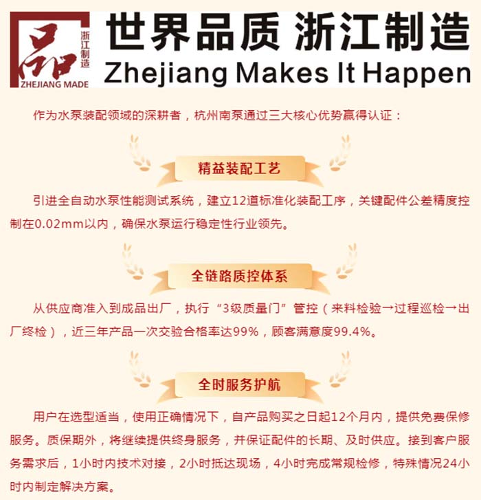 从配件到整机,从标准到卓越,杭州南泵始终以产品质量为根基,以客户价值为导向。手握“品字标”这张金名片,杭泵人将继续以匠心装配诠释浙江制造精神,让每一台水泵成为传递品质的承诺! |