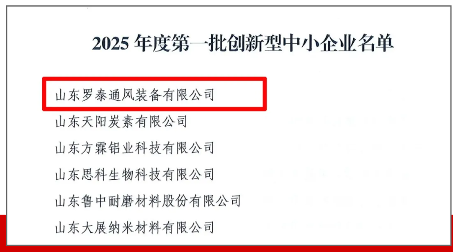 近日, 滨州市工业和信息化局公布山东省2025年度第一批创新型中小企业名单(滨州部分),山东罗泰通风装备凭借卓越的技术创新能力和强劲的市场竞争力, 荣耀上榜。能够从众多优秀企业中脱颖而出,充分彰显罗泰通风装备在细分赛道中的领先地位和强劲的创新活力。