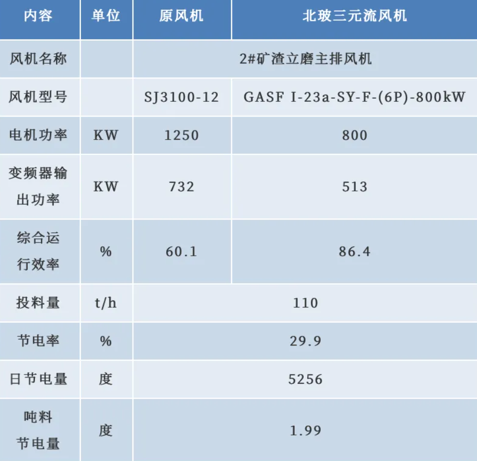 在国家《推动大规模设备更新和消费品以旧换新行动方案》的引领下,工业领域正掀起一场以先进技术为核心的设备升级浪潮。近日,包钢集团旗下一家水泥企业采用北玻三元流风机对矿渣立磨系统主排风机进行节能改造,交出了一份亮眼的技改成绩单:改造后单台设备节电率达29.9%,吨料电耗显著降低1.99度,年节电量突破160万度,相当于节约标准煤196吨,减少二氧化碳排放约523吨。