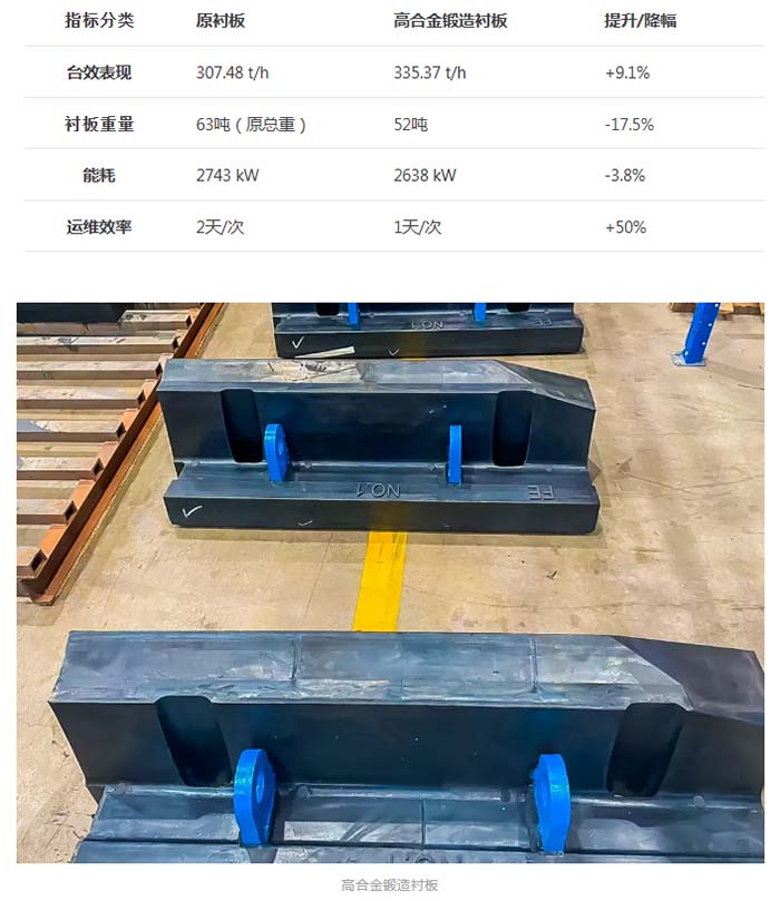 “传统金属衬板的使用寿命只有4个月左右,频繁更换衬板不仅会减少我们设备运转时间,同时还会增加设备检修的安全风险。这套高合金锻造衬板的效果还是很显著的!解决了我们设备管理的一个大的痛点,已经稳定运行了7个月,我们全年可以减少3天检修时间,保守估计全年可增加经济效益500万元以上!”