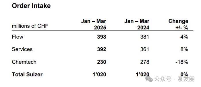 在经历2023年和2024年一季度高速增长后,苏尔寿在2025年第一季度的订单量保持持平,约10.2亿瑞士法郎(合约87.7亿人民币),公司三大核心业务中的两项——流体设备部门和服务部门部均实现增长。