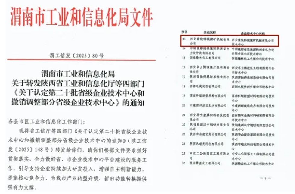 近日,陕西省工业和信息化厅发布《第二十批省级企业技术中心拟认定名单公示》,韩城煤机公司成功通过评审,成为本次获批的省级企业技术中心之一,彰显了煤矿装备制造领域的技术积累与创新实力。