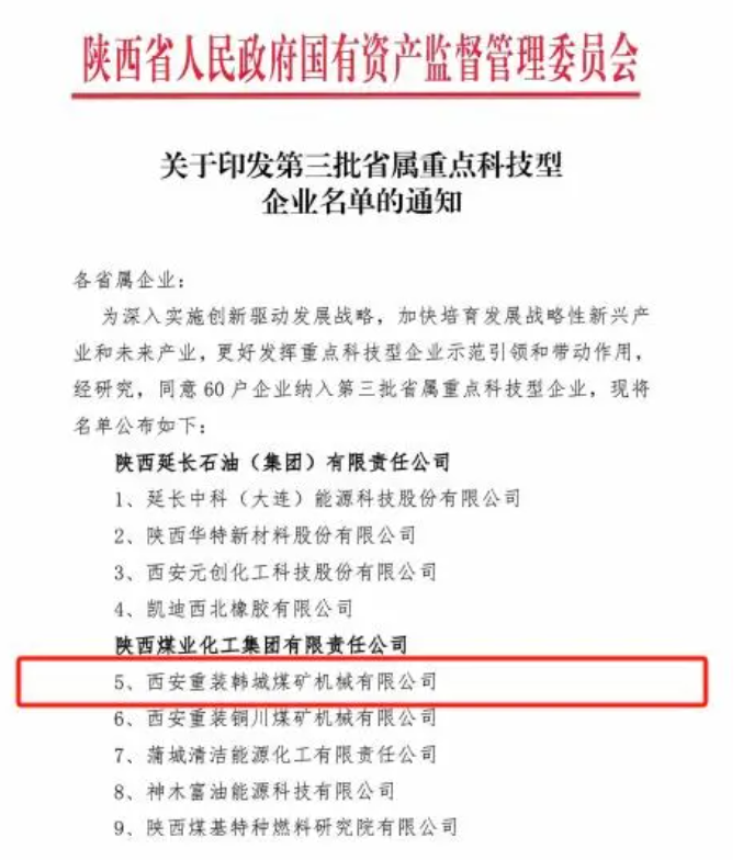 近日,陕西省国资委公布第三批省属重点科技型企业名单,韩城煤机公司凭借在科技创新领域的突出表现和强劲发展潜力,跻身省属国企科技创新梯队重要成员。