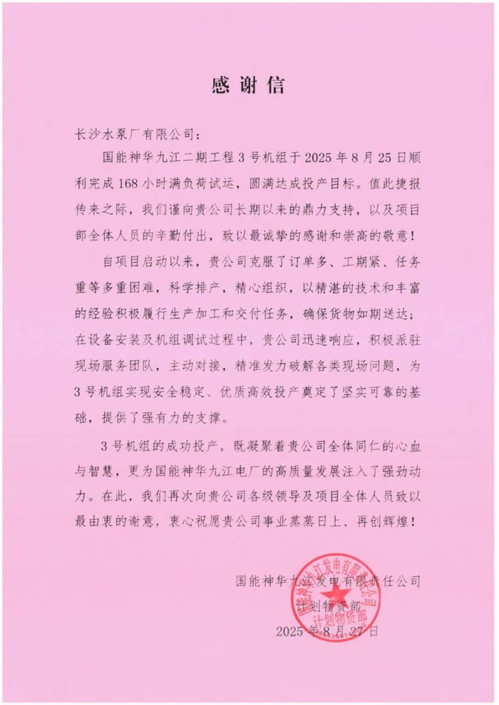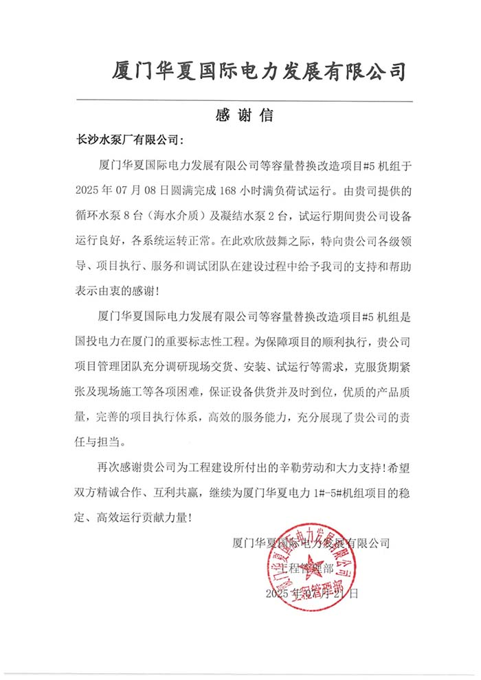 近日,长泵公司收到国能神华九江二期工程、厦门华夏国际电力发展有限公司的感谢信,信中高度赞扬了长泵公司在项目合作中所展现出的专业精神和技术实力。用户特别提到,长泵公司的团队在项目执行过程中,积极响应、高效沟通,不仅按时完成了设备安装与调试工作,克服困难保证了项目进度,还展现了售后服务的能力。团队的专业素养和技术水平令人印象深刻,每一个细节都处理得恰到好处,确保了设备的稳定运行和高效性能。这是对长泵公司“用诚信打造品牌 为客户创造价值”企业理念的生动诠释。长泵公司深知,客户的满意是企业发展的最大动力,每一封感谢信都是对团队辛勤付出的最好回报。未来,长泵公司将继续秉承这一理念,不断提升服务质量和技术水平,为更多客户提供优质的产品和服务,携手共创更加辉煌的明天。