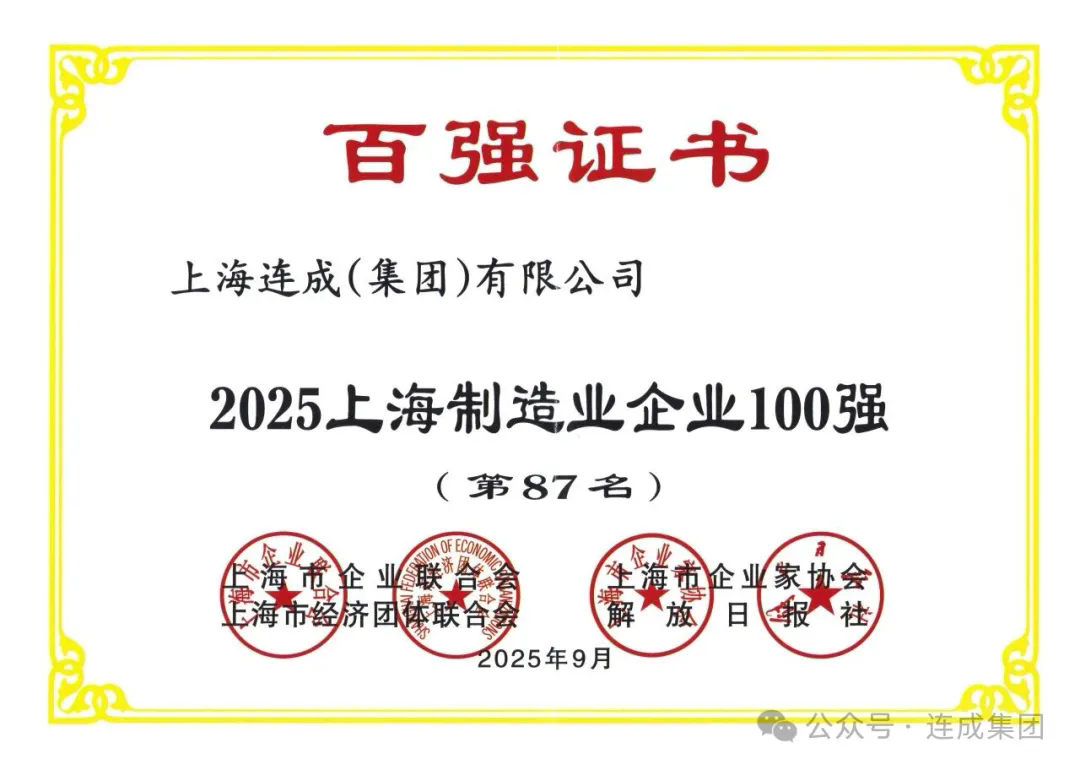 上海连成(集团)有限公司荣膺“2025上海民营制造业企业100强”第55名、“2025上海制造业企业100强”第87名。两项榜单由上海市企业联合会、市企业家协会、市经济团体联合会和解放日报联合发布,并于2025年9月正式揭晓。