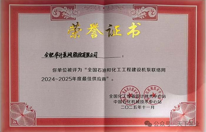 近日,合肥华升泵阀股份有限公司凭借在石油化工流体装备领域的技术积淀、稳定可靠的产品品质与优质服务,成功斩获“全国石油和化工工程建设机泵联络网2024~2025年度最佳供应商”荣誉称号!这一奖项由全国化工设备设计技术中心站、中国石化机械技术中心站联合评定,是行业对供应商综合实力的权威认可,更是广大客户长期以来信任与支持的有力见证。