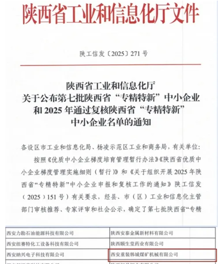 “专精特新”是企业走专业化、精细化、特色化、创新型发展道路的重要标志。韩城煤机公司凭借在煤矿机械领域的长期深耕与技术积淀,成功通过陕西省工业和信息化厅的严格认定。公司始终聚焦智能化开采装备的研发与应用,围绕煤矿智能化、绿色化发展需求,以“专”铸基、以“精”提质、以“新”突破,系统攻克了智能化带式输送机系统、无基础快速拆装顺槽可伸缩带式输送机、高效低噪声智能通风机系统、综采面智能化回撤安装平台、智能快速伸缩中间部自移机尾等一系列关键技术,形成了具备行业先进水平的自主产品体系,为企业高质量发展注入强劲技术动力。
