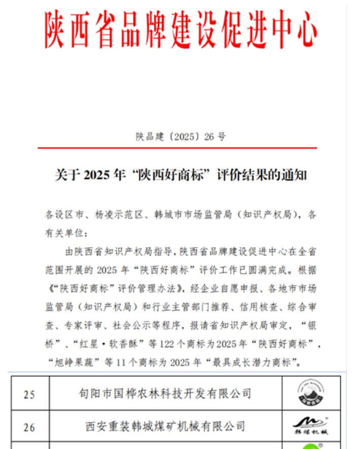 在陕西省市场监督管理局组织的评选中,韩城煤机公司核心商标通过了“陕西好商标”的复审。这一荣誉体现了企业在品牌培育、质量管理、诚信经营等方面持续不断的扎实成效。公司以“品牌兴企、质量立企”为战略指引,构建了覆盖研发、制造、服务全过程的品牌管理体系,通过统一视觉形象、规范传播策略,持续提升品牌辨识度与市场影响力。坚持以客户为中心,将技术优势转化为品牌竞争力,以优质产品、定制化方案与高效服务赢得市场信任,塑造了专业、可靠、负责任的品牌形象。