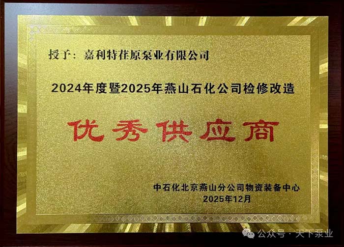 近日,嘉利特荏原泵业有限公司收获一份来自燕山石化的认可——授予嘉利特荏原为2025年燕山石化公司检修改造项目“优秀供应商”的荣誉称号!这充分体现了客户对EGP公司在产品质量、交付保障与服务水准等方面的持续认可,也彰显了双方长期深度协同、互信共赢的坚实合作基础。