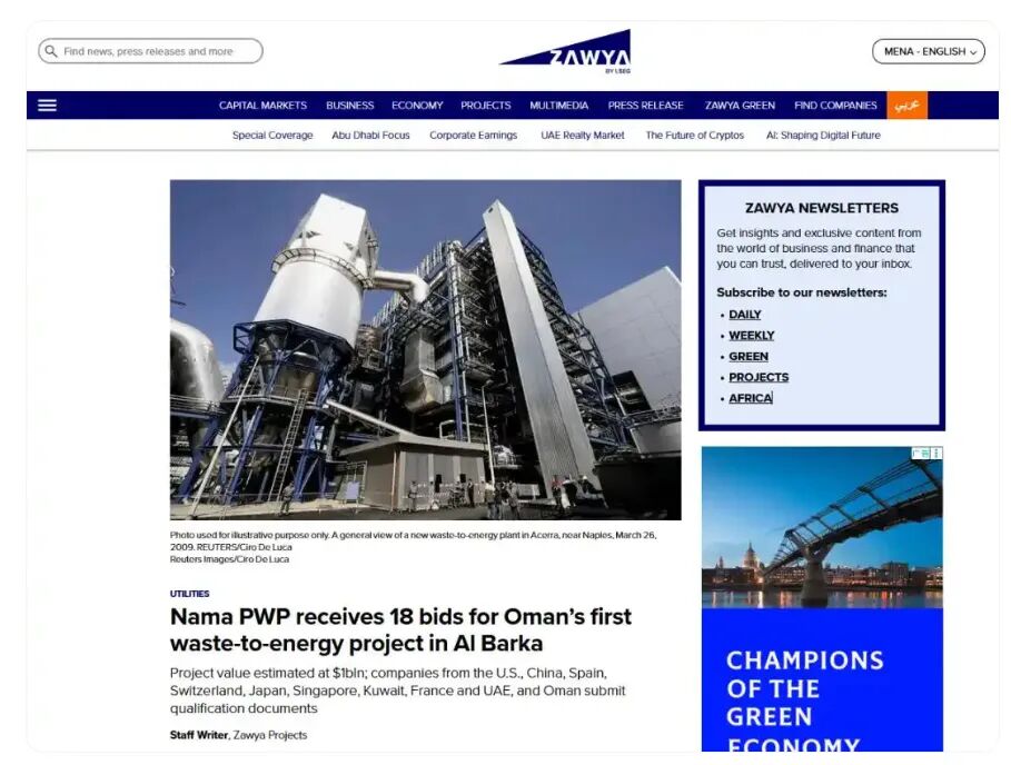 阿曼首个垃圾发电项目,投资额高达10亿美金。
