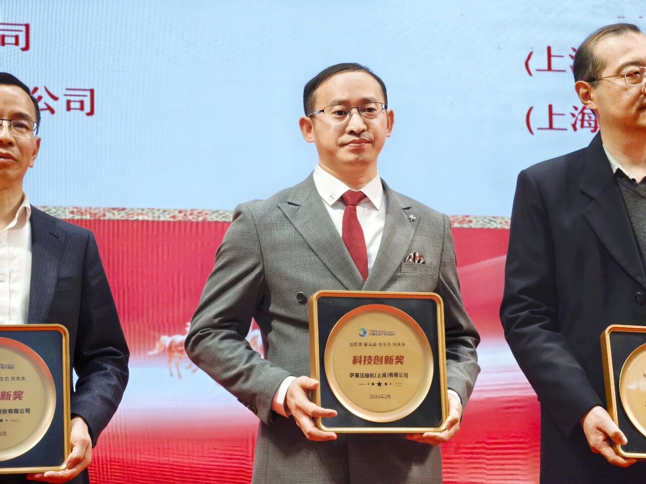 2月2日下午在上海湾区高新区2026年经济工作会议上,萨震节能空压机荣获“科技创新奖”,上海湾区高新区与萨震二期新工厂土地签约仪式同时举办。