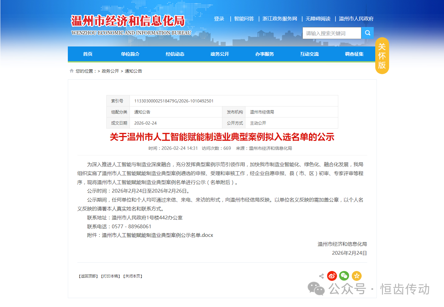 2026年2月24日,浙江恒齿传动股份有限公司(以下简称为“恒齿传动”)“恒齿传动产品AI选型”项目成功入选“温州市人工智能赋能制造业典型案例名单”。作为深耕减速机领域十余年的国家高新技术企业,恒齿传动始终以创新驱动发展,积极探索人工智能与制造业深度融合的新路径,此次入选是对恒齿智能化转型成果的高度肯定。