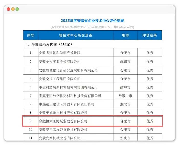 合肥恒大江海泵业股份有限公司凭借在技术研发、创新体系建设与成果转化方面的综合实力,在全省超2000家参评企业中脱颖而出,获评最高“优秀”等级(仅110家),并荣列“优秀”等级第九位,充分彰显了其行业领先的创新能力和扎实的研发基础。