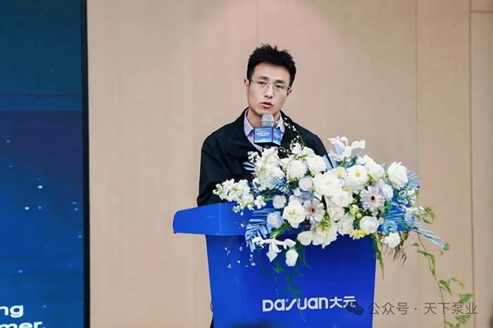 会上,研发部部长王于宽带来大元技术核心优势和新品介绍的精彩分享。他首先介绍了大元研发团队的实力,随后详细介绍了多款重磅新品,包括FP元宝智能永磁屏蔽式增压泵、Cm-Y大流量离心泵、ZQX直流田园泵、WQ/D-C雷霆切割泵及多款井泵系列新品,充分展示了大元在不同应用场景下的技术布局。菲律宾经销商对新产品表现出浓厚兴趣,纷纷拍照记录。