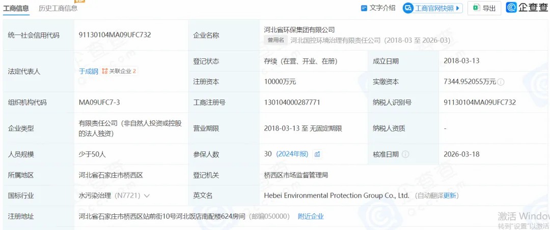 企查查消息,近日,河北国控环境治理有限责任公司正式更名为河北省环保集团有限公司,注册资本1亿元。