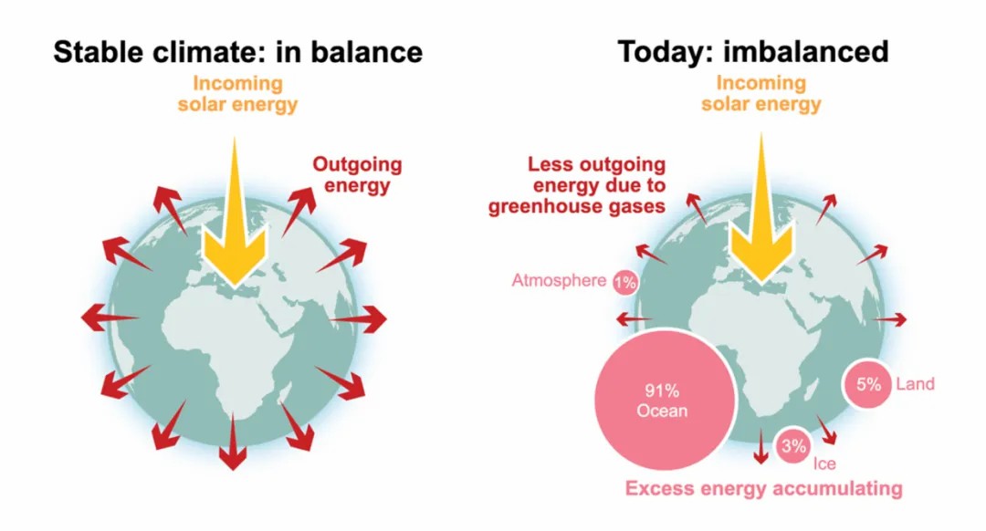 地球能量失衡是指太阳辐射进入地球系统的能量与离开地球大气层的能量之差。如果进入地球系统的能量大于离开地球大气层的能量,就意味着大量热量累积在地球系统中。