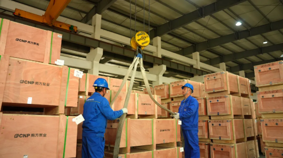 南方泵业成品仓储区内,数台叉车同时作业,在货架与货车之间往返穿梭,精准地将码放整齐的水泵成品有序入库、装车。从节后复工到现在,工人已连续奋战三周,日均发货量突破2500台。在这个复工季,从生产端到交付端,每一个环节都在高速运转。